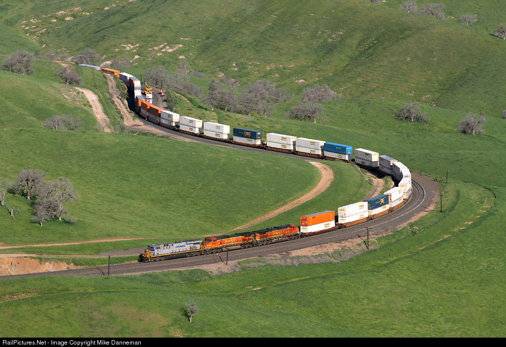 Passing maintenance-of-way forces in the siding, an eastbound BNSF intermodal train climbs the grade up toward Tehachapi Pass at Bealville, California, on February 24, 2016. Leading the train toward the horseshoe curve at Allard is CREX No. 1323 and two BNSF Dash 9s.