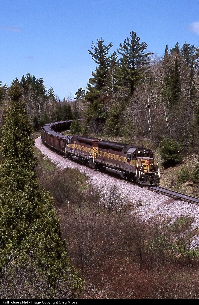 WC 6614 is about to duck under Hwy M35 near Marquette, MI with an ore train from Empire Mine to Escanaba. The CNW was the longtime owner of this line, followed by the UP, WC, then CN. Unfortunately, the Empire Mine has closed and very little ore traffic is left on this line.