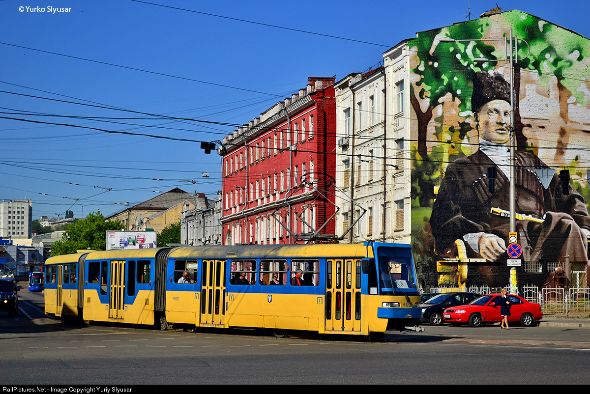 | Tramway KT3UA "Cobra" #402 was turned from Starovokzal'na street to Zhylyans'ka street. Behind can see mural in which shows het'man Pavlo Skoropadskyi wich rule Ukrainian State (Ukrains'ka Derzhava) from 29 April to 14 December 1918.