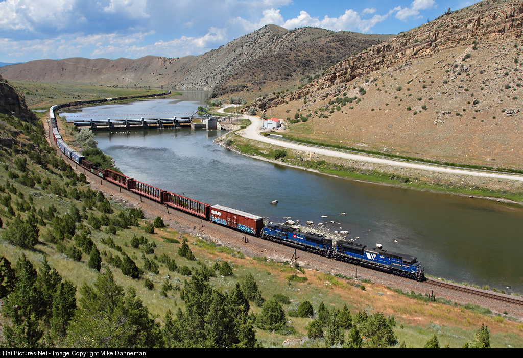 Montana Rail Link’s MLAUMIS passes Toston Dam in Lombard Canyon east of Toston, Montana, on June 28, 2016. EMD SD70ACes Nos. 4300 and 4403 power the Laurel to Missoula manifest freight.