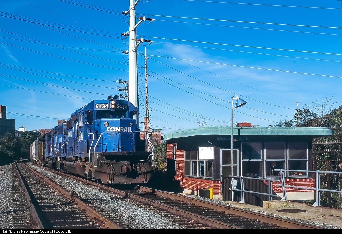 Rolling east on the Lebanon Valley Line, a Conrail freight passes Valley Junction tower in West Reading, Pennsylvania. Although the tower is at this level, the actual Valley Junction is on the Reading Belt Line, which crosses below the Lebanon Valley Line directly under the photographer. Valley Junction is a wye joining the Belt line with a connector to the Lebanon Valley Line at Wyomissing Junction, about a mile west of this location. The weekend operator at Valley Junction was frequently an older gentleman named Mr. Gracely, who, in a thick Pennsylvania Dutch accent, would provide a lineup, and also tell anybody who was interested what he thought of the latest bonehead move that the trainmaster had made.