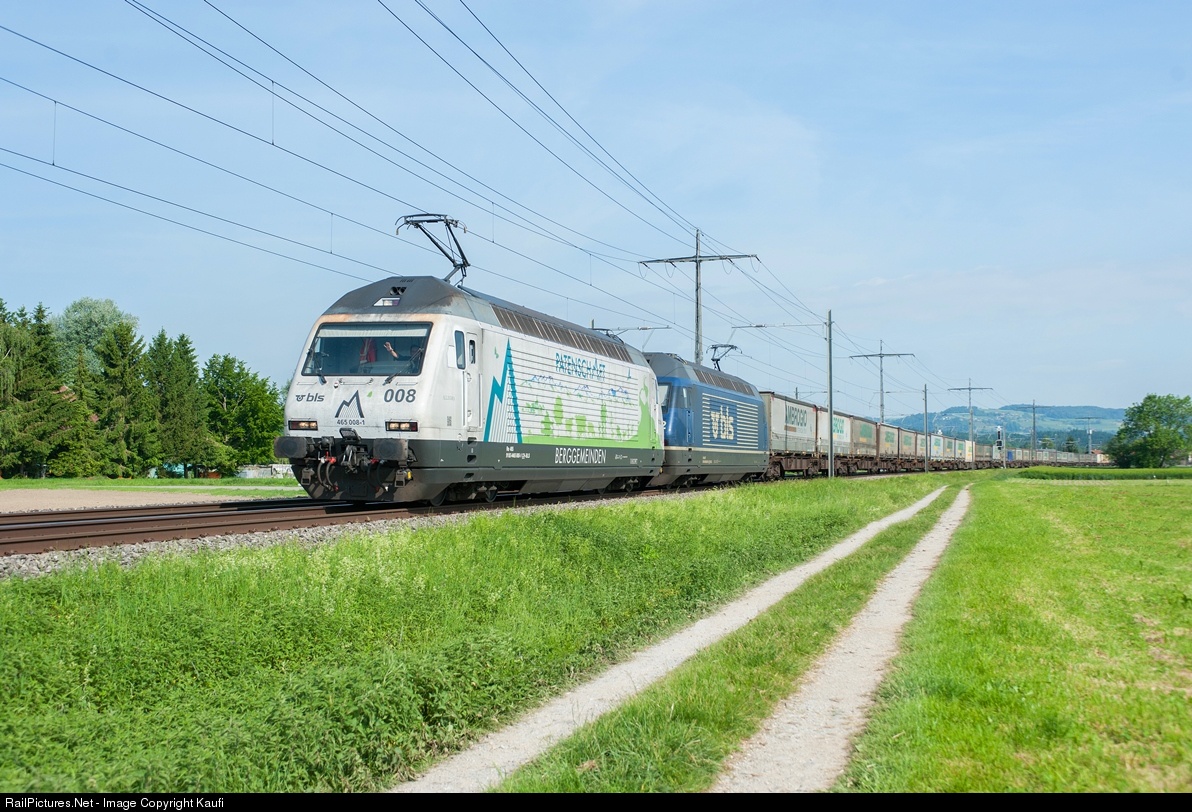 | BLS Re 465 008, advertising for a sponsorship of mountain communities, is pulling a long freight train together with 465 002 towards Italy. BLS obviously uses their locomotives still for freight- as for passenger trains, a few days later 465 008 could be seen in front of a Interregio train in Bern. |
