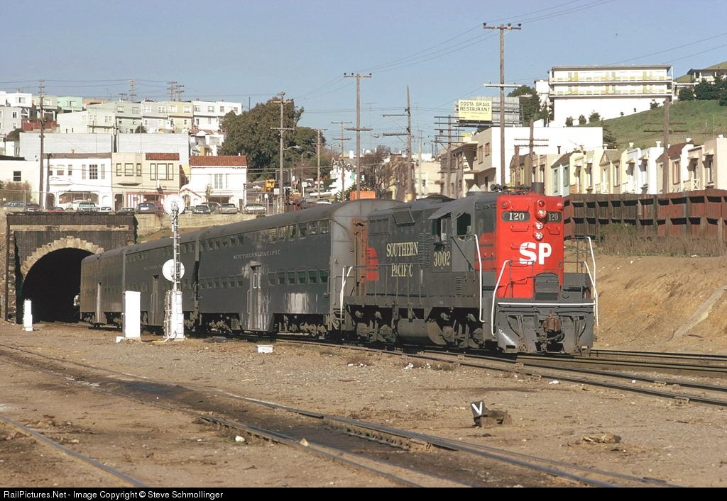 Passenger GP9 3002 emerges from tunnel 4 at Bayshore with three bilevel coaches for San Jose.