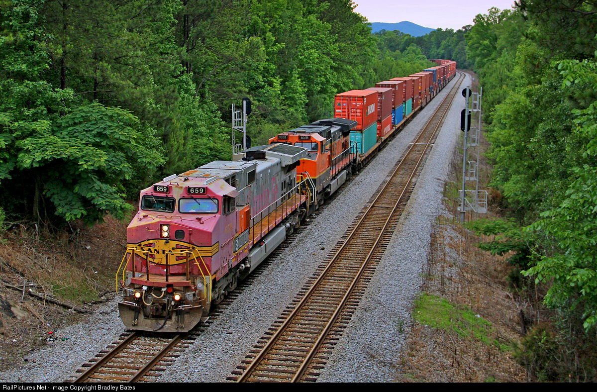 | Over the years the BNSF patch as wore off and is making this C44-9W in the Warbonnet Paint scheme look like it’s supposed to. The 659 along with BNSF C44-9W 1031 in the H1 Paint scheme are seen here in charge of CSX DoubleStack Train Q181-28 as they head South through Shocco Springs, AL. On an overcast afternoon. |