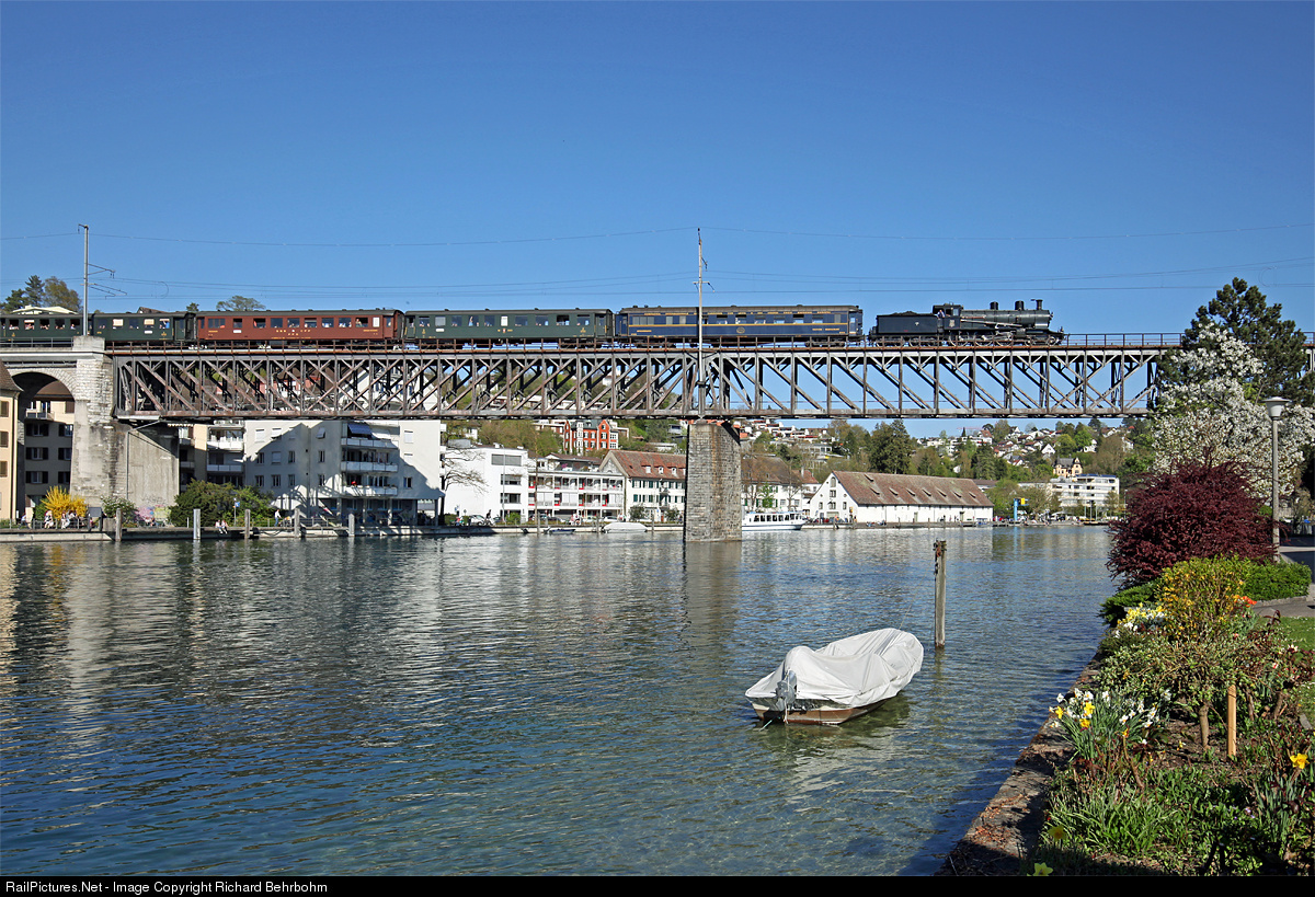 | The 4-6-0 express train steamlocomotive A 3/5 No 705, built in 1904 by SLM, is crossing the Rhine Bridge between Schaffhausen and Feuerthalen. |