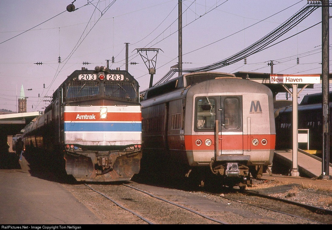 An eastbound Corridor train from Boston has arrived at New Haven late on a March afternoon, and F40PH 203 will give way to an AEM-7 for the rest of the trip to Washington. The angular nose of the F40 contrasts with the rounded face of the Metro North M2 class MU on the adjacent track.