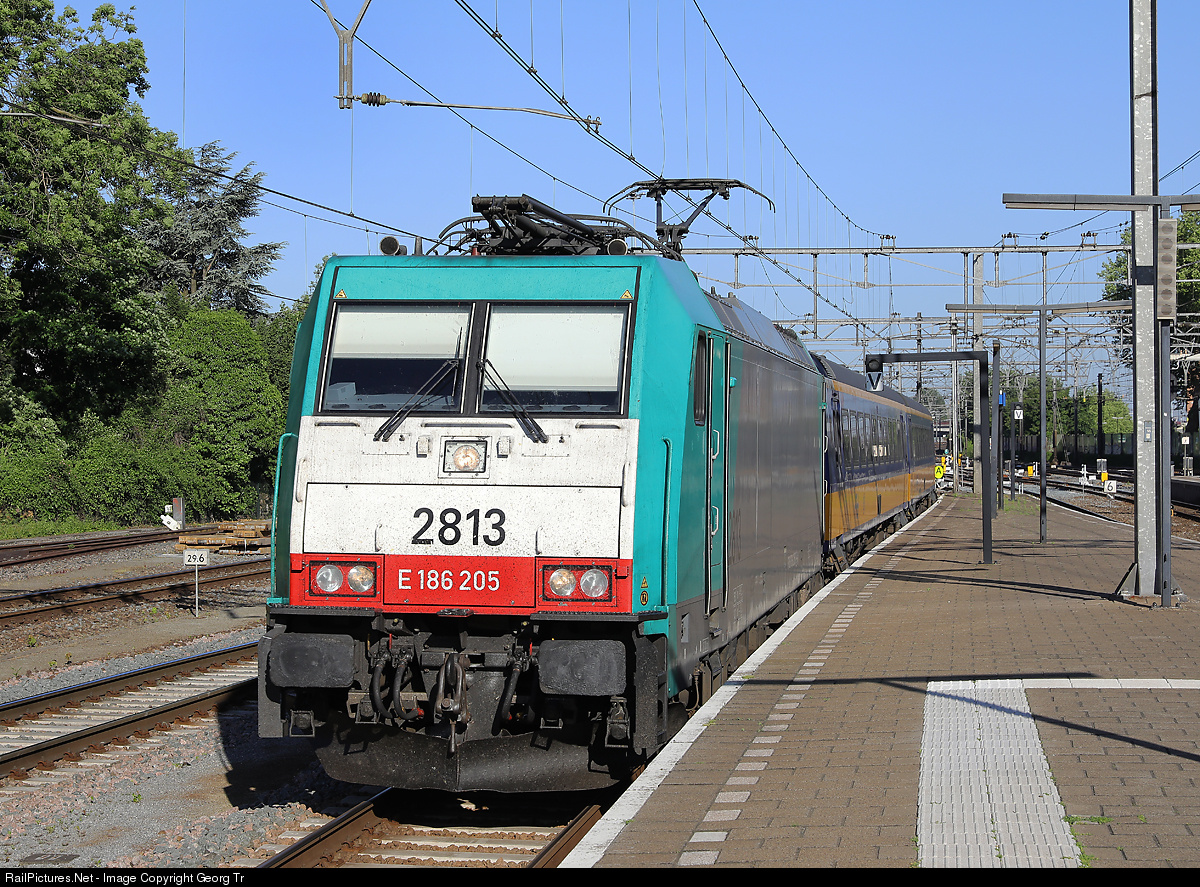 Bombardier TRAXX F 140 MS 186 # 205 of Angel Trains Cargo (ATC), now Alpha Trains, built in 2008, leased to the belgian SNCB (Société Nationale des Chemins de Fer Belges), is pulling Intercity International # 9216 from Amsterdam Centraal via Rotterdam-Roosendaal-Antwerpen to Brussel Midi into Dordrecht station. The locomotive is operated by COBRA (Corridor Operations NMBS/SNCB DB Schenker Rail N. V., Bruxelles) with # 2813.