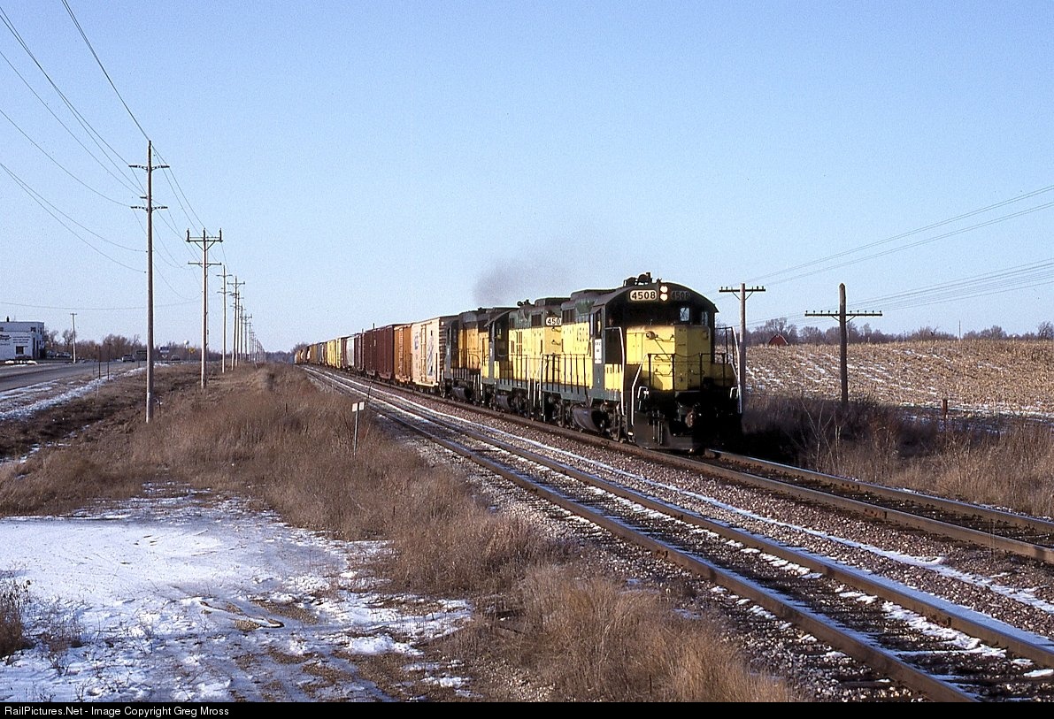 FRVR 4508 has a eastbound (actually southbound) freight in tow as it passes Barton Siding in Barton, WI in March of 1992. Once CNW's Airline Subdivision, this line, and the FRVR is gone here. The FRVR had some really dedicated fans, but they were greatly outnumbered by the more popular Wisconsin Central at the time.