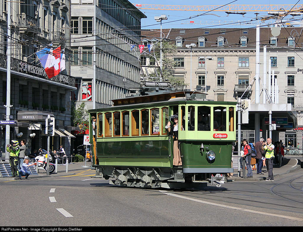 | Beautiful tramway from the former 'Strassenbahn Zürich - Örlikon - Seebach', built 1897, with a few passengers with authentic costumes. This is the oldest fully funcitional tramway in Switzerland. Even the the policeman takes photos |