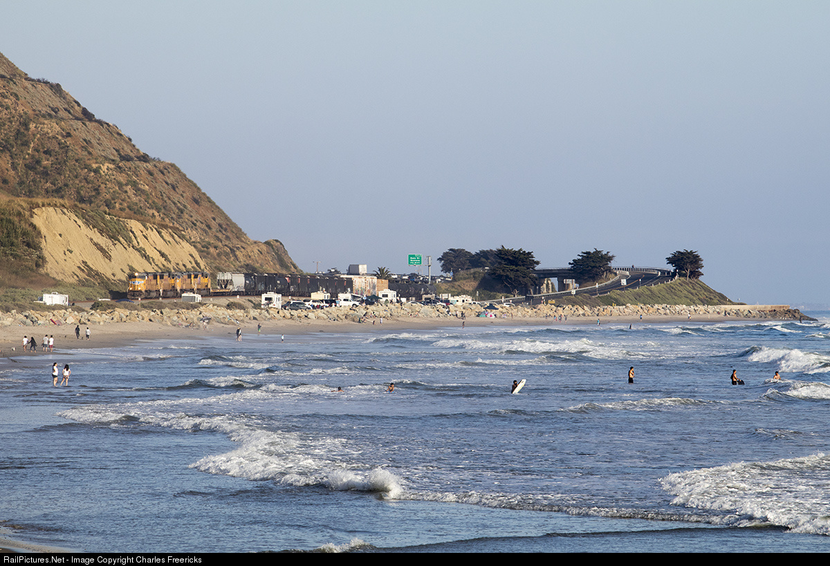 | Beach goers enjoy Memorial Day along the California Coast, barely notice the passing Union Pacific's twice a week northbound Guadalupe Turn as it glides remarkably quietly on a safely separated right of way. |