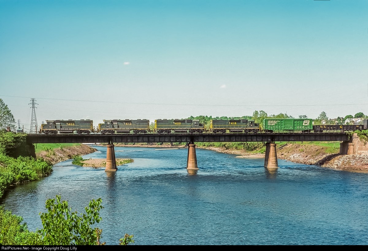 After shooting my previous photo of four Delaware & Hudson GP39-2’s getting their air after doubling in Allentown Yard, I worked my way down the riverbank for a different perspective. The broadside view shows the symmetry of the lashup, but close examination yields three different variations of the way they were patched. Lead unit 7403 has a D&H shield on the side of its cab, trailing units 7412 and 7420 have “D & H” lettered over the blacked-out Reading diamond, and the fourth GP39-2 has a script D&H on its cab side.