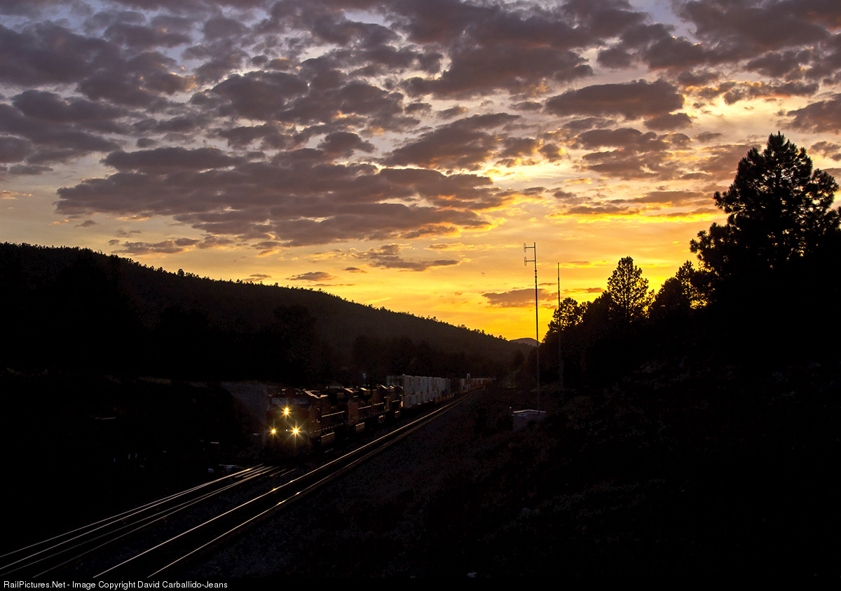 Slowly grinding up the western slope of the Arizona Divide, along BNSF's Seligman Subdivision, four GE locomotives labor as they pull a heavy Los Angeles, CA to Memphis, TN intermodal train. With the sun dipping below the horizon, it'll be night fall by the time this train reaches the 7,335' high summit as they pass through Williams Jct., where the line to Phoenix splits off from the Transcon.
