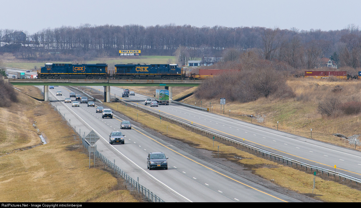 CSX intermodal train L157 crosses over I-90 and heads west towards Batavia.