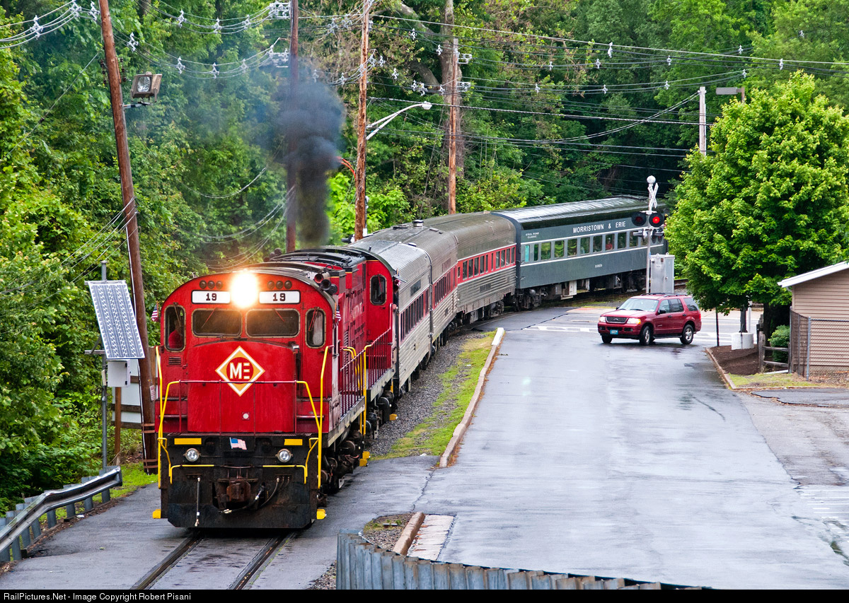 | M&E 19 and 18 are teamed up for what might be the last time on a "Farewell to M&E 19" excursion. M&E 19 was retired from active service in 2016, but will be preserved as part of the Tri-State Railway Historical Society collection. This unit is expected to be moved to their facility in Boonton, NJ shortly after this excursion. The train is approaching the western end of the excursion run, where the train stopped just short of M&E's engine shop before the consist was shoved east back to Whippany. |
