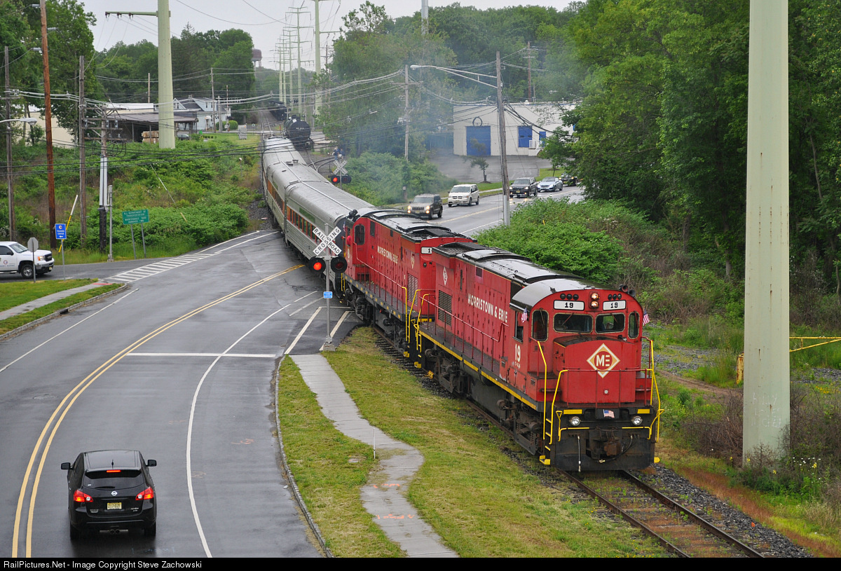 On the return trip to Whippany all of the Tri-State Members on board M&E 19's farewell excursion were treated to a photo run by of the train at Jefferson Road and Eden Lane. The striking red duo are seen making their way across Eden Lane in preparation for the run by as members assume their desired positions trackside.