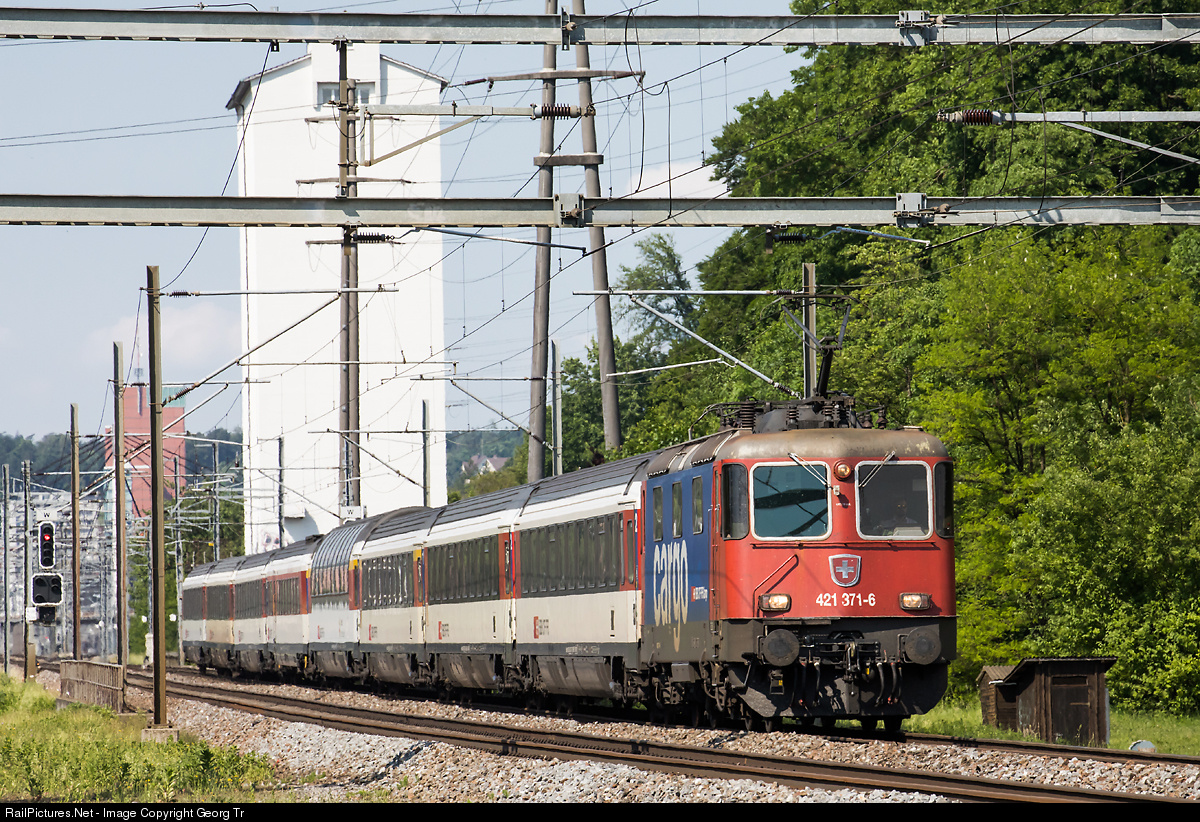 | Re 421 # 371 of SBB Cargo, rented by the passenger division, is pulling Eurocity 194 Munich-Zürich between Lindau and Zürich, here the train left Winterthur shortly. The fourth car is a Apm Panorama car. |