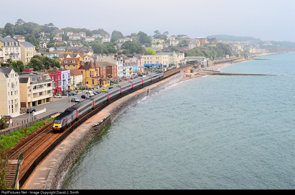 | The tide is high and the morning sun has just broken through the clouds as an Arriva Cross Country service from Leeds to Plymouth runs along the sea wall at Dawlish. |