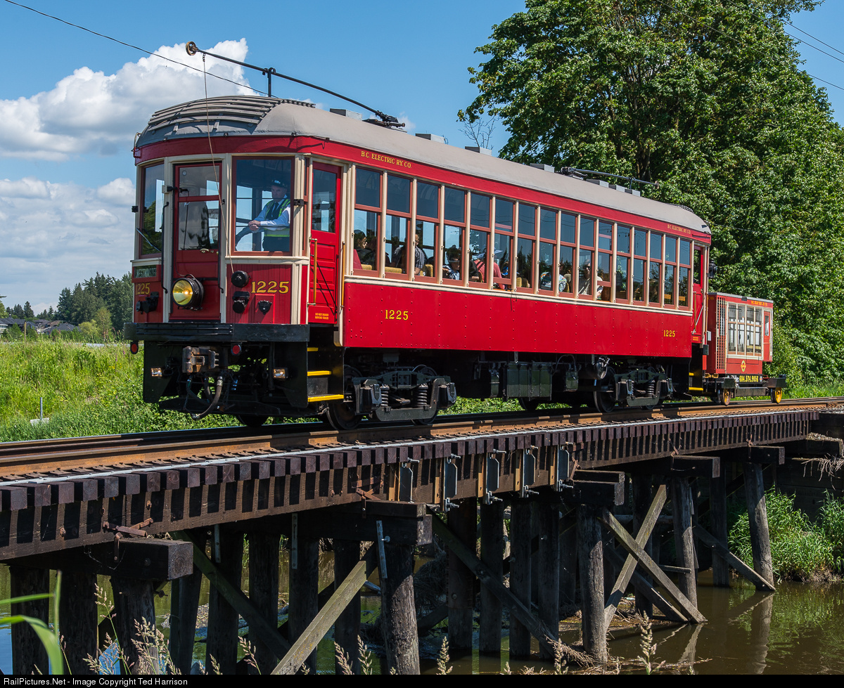 | BCER 1225 crosses the Serpentine River with a load of passengers bound for Sullivan Station. The car was built by the St. Louis Car Company in 1913 and worked on the BC Electric Interurban lines until it was retired in 1958. Today, 1225 is operated by the Fraser Valley Heritage Railway Society, offering weekend trips on the former BCER line. |