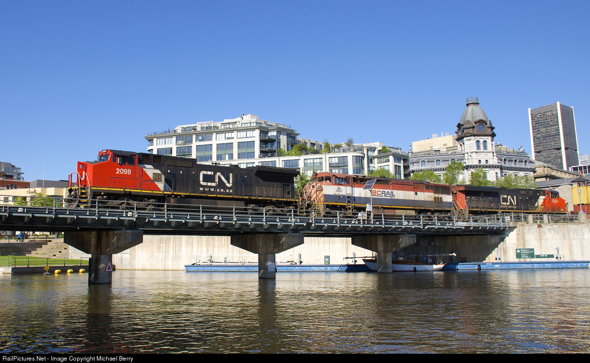 | CN 149 has CN 2098, BCOL 4607 & CN 2324 for power as it crosses the Lachine Canal in Old Montreal, at the start of its run to Chicago. |