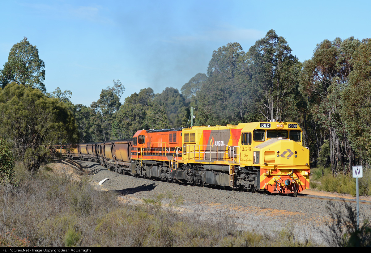 | Aurizon's DBZ2309 & DBZ2310 work 584 loaded coal train from the Premier coal mine to Hamilton. The two recently reactivated DBZ class are the only of it's class on the active locomotive roster and are both put hard to work up the 1 in 40 grade near Ewington Junction, Collie. |