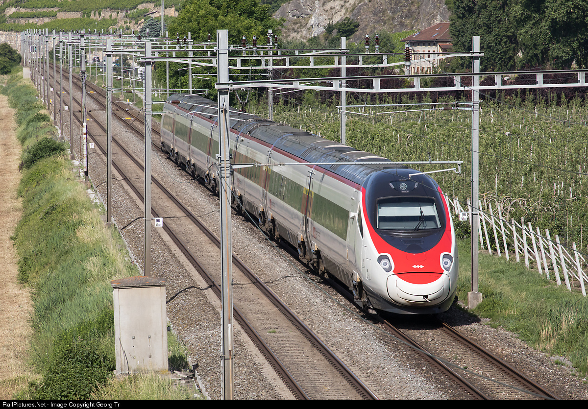 Highspeed tilting train RABe 503 # 0.. is running the Eurocity 37 from Geneva to Milano, between Sion and St-Léonard.