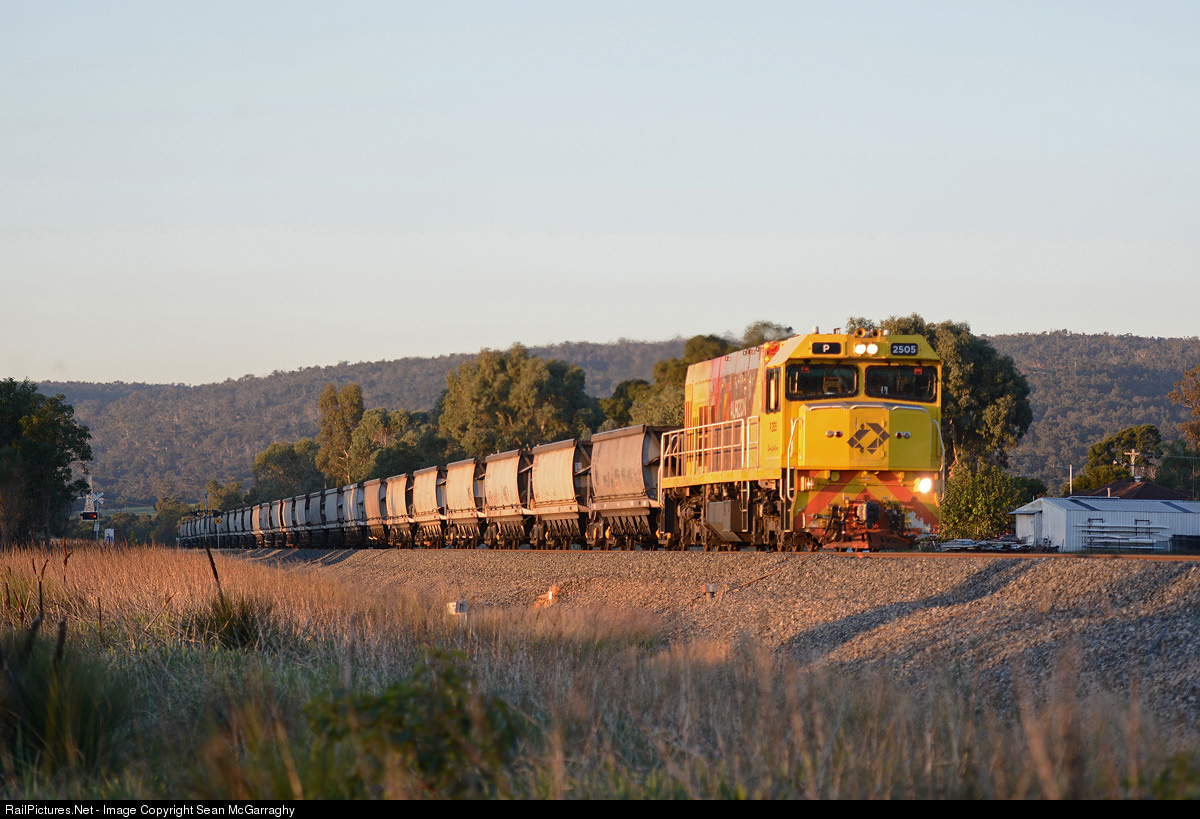 | With the sun rapidly disappearing over the horizon, P2505 races through North Dandalup with 253 empty Soundcem coal to Ewington coal mine in Collie. |