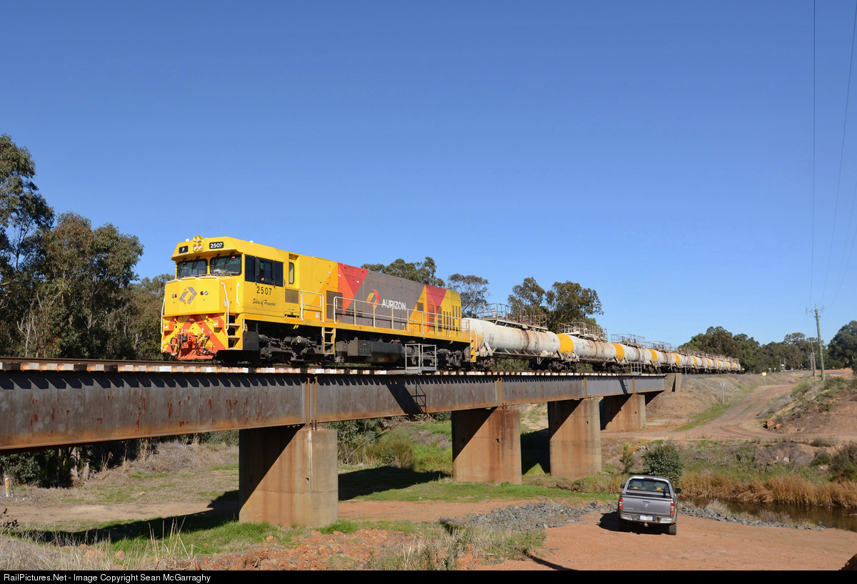 | A short 10 wagon consist of loaded caustic soda tankers crosses the Collie River near Burekup with P2507 providing the power. |