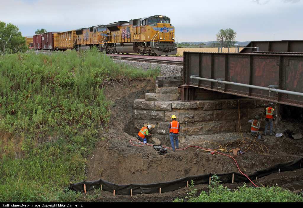 As part of a double track project from milepost 331.58 to 334.79 between Missouri Valley and Blair, Iowa, crews also work on repairs and upgrades to the stone abutments for the bridges over Allen Creek on August 16, 2012. As work is performed, rail traffic still flows as a westbound UP freight led by EMD SD70ACe No. 8454 rumbles overhead.
