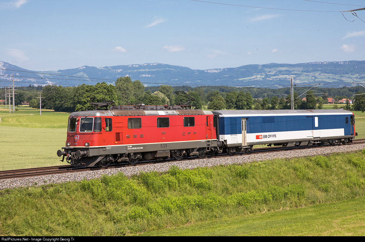 | Re 4/4 II # 11304 of the SBB with "Jail train" 9990 from Bassersdorf to Bern Weyermannshaus near Bollodingen on the line Olten-Berne. In the cab car St # 50 85 89-33 901-1 were transported prisoners awaiting trial. |