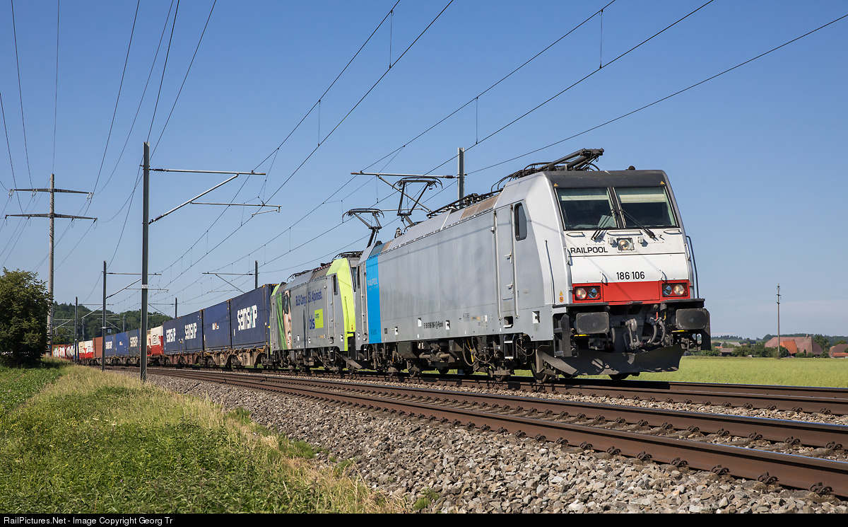 186 # 106 of Railpool leasing company, rented to the BLS, and Re 486 # 502 of the BLS in multiple (both are Bombardier TRAXX F140 MS), are pulling intermodal train 43511 from Rotterdam Europoort/Netherlands to Novara Boschetto/Italy via the Lötschberg-Simplon route near Bollodingen.