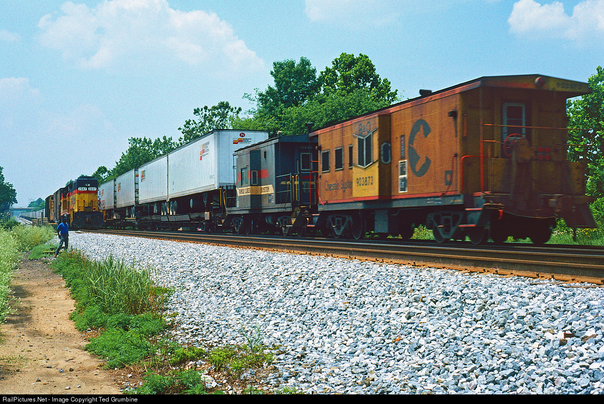 “Fresh Air” The conductor of the “East End Local” (B829), with Chessie System/B&O GP38 2047 (CSX#), gets some fresh air and conducts a “roll by” inspection of R171 (Orange Blossom Special South), while the local is being held on Track 2 at Rossville for the priority westbound TOFC to clear the interlocking, on July 3, 1987. Note the SBD transfer caboose in Family Lines paint on the R171.