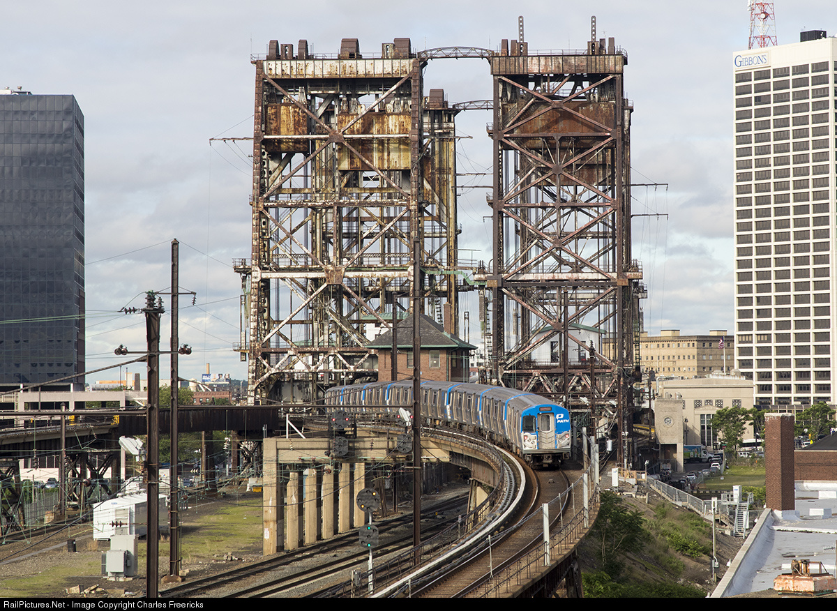 A westbound PATH train climbs the grade between Harrison station and Dock Bridge on its way to Newark's Penn Station (just on the other side of the bridge).