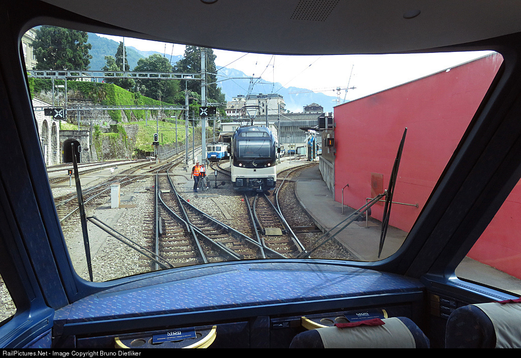 | View of the cab at the head in the Panoramic Train of the Golden Pass Line (Montreux - Zweisimmen) with the V.I.P.-seats (first class ticket and surcharge, see also #620020). In this moment we leave the station Montreux, we run uphill on the track in the middle. Right a few tracks of the depot with different trains |