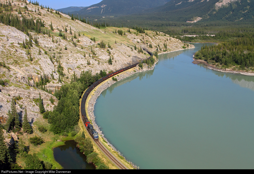 On the eastern boundary of Jasper National Park, Canadian National train No. 303 exits Brule Tunnel and approaches Park Gate, Alberta, on the afternoon of July 12, 2014. Leading the train is CN EMD SD70ACe No. 8101, still in blue and gray demonstrator paint.