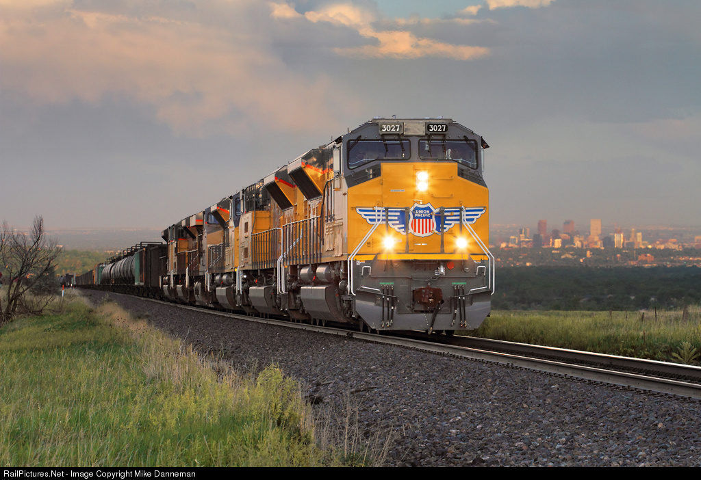 With the warm, pastel colors of sunset settling in over Denver, three new Union Pacific EMD SD70ACe-T4s lead MNYRO out of Leyden, Colorado, at 8:10 p.m. on June 14, 2017. The three T4s—Nos. 3027, 3019, 3014—along with a rear DPU (the trailing GE ES44AC and two SD70ACes are dead-in-consist) power the westbound train up the 2-percent grade and it was amazing how quiet they were.