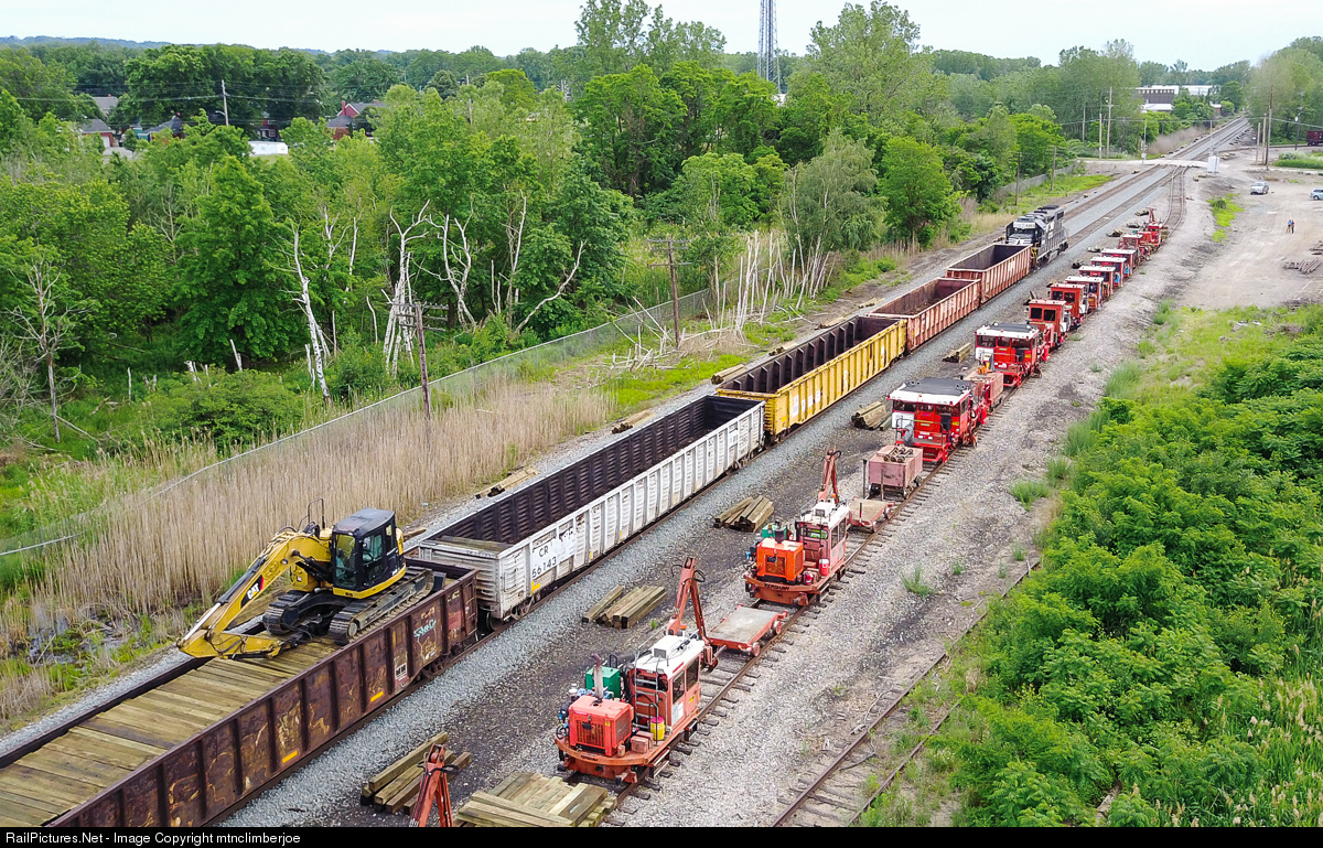 An NS GP38-2 pushes a tie train on Dean Siding in Erie while MOW equipment has arrived on the storage track for a tie replacement project on the ex. NKP trackage.