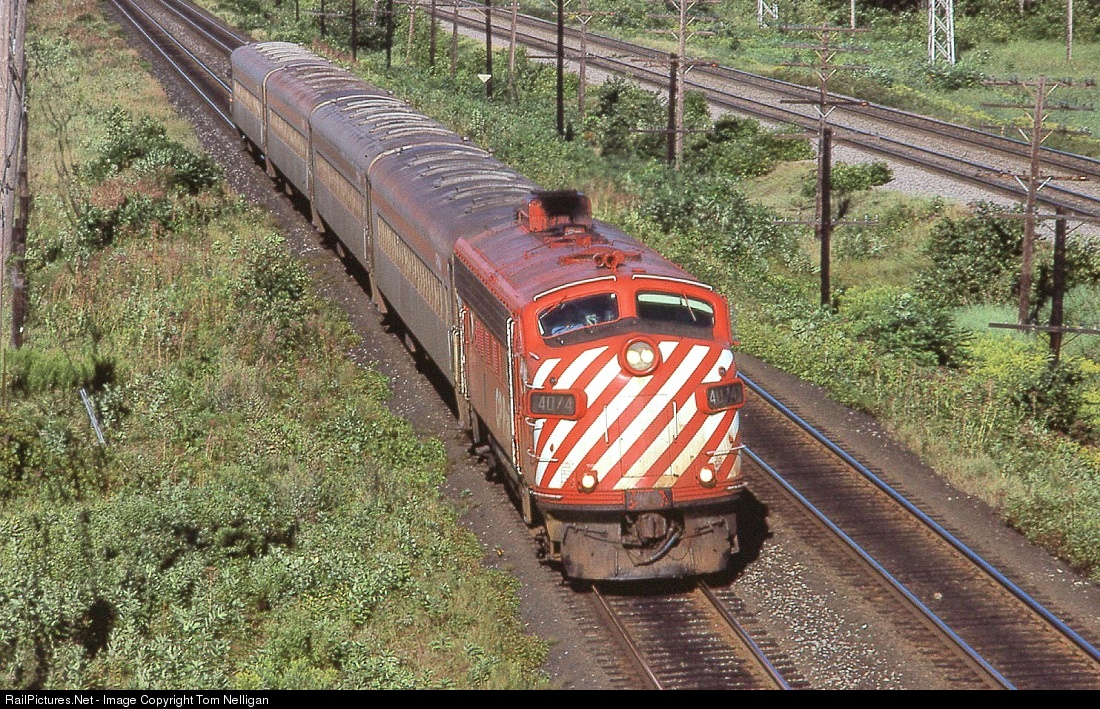 An evening rush hour commuter train out of Montreal behind candy-striped Canadian Pacific FP7 4074 speeds west at Beaconsfield, Quebec, on the Lakeshore route. Prior to public operation of these trains by CTCUM and then AMT, locomotive-hauled consists like this were seen only at rush hours, with RDCs covering all off-peak runs.