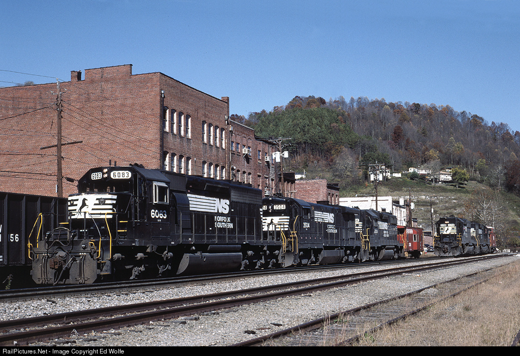 NS U52, with three locomotives and a Southern bay window cab, waits in #1 track at Appalachia for NS U53, with two engines and an N&W cab, to pass. U53 is en route to Westmoreland Coal's Appalachia transloader to gather 20 yellow ball empties destined to Roda, on the ex-Interstate Railroad's Roda Branch. Before U52 can continue its trip back to Andover Yard, it will also have to wait for an empty J03 Dump Train destined to Holton to pass.