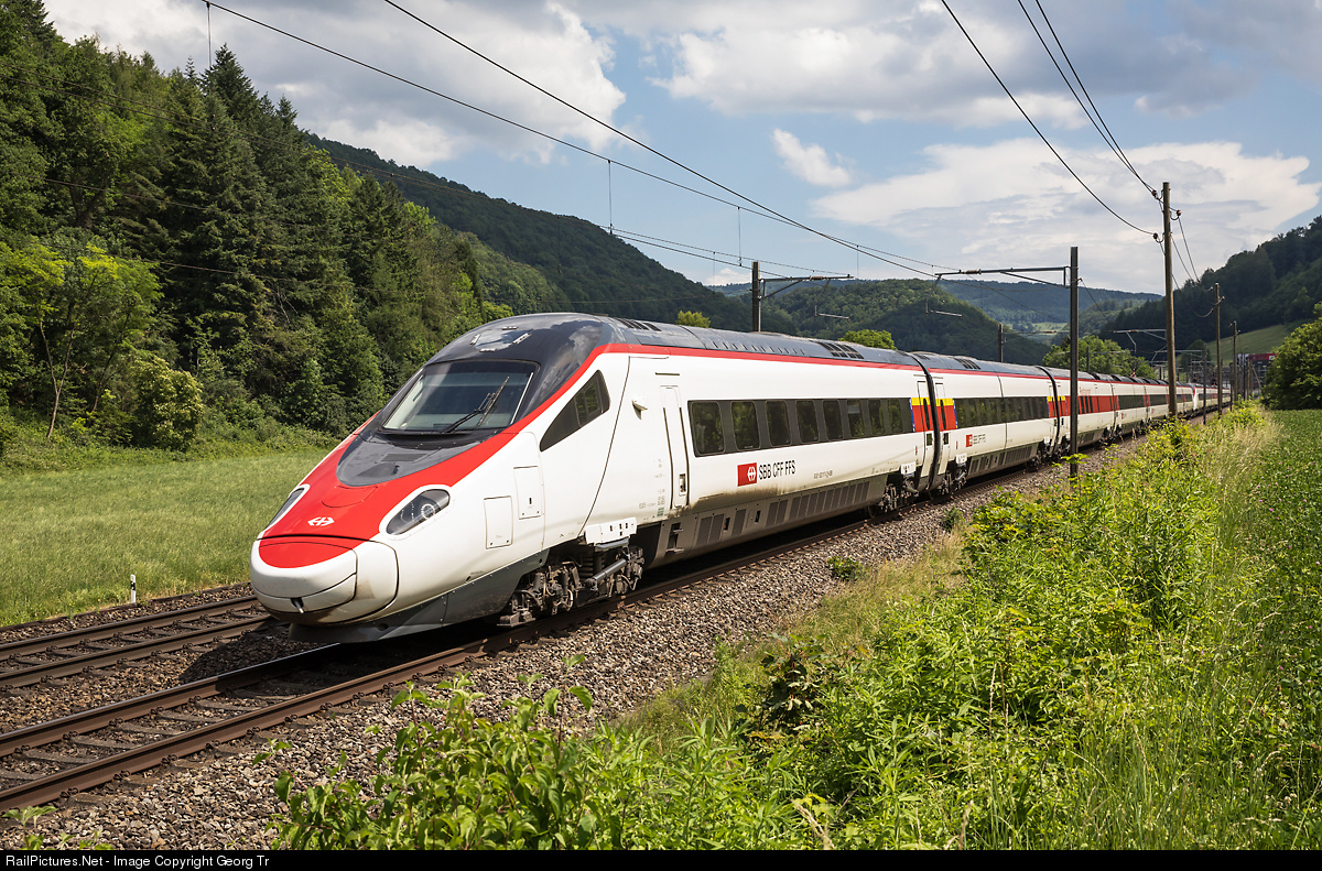 | Highspeed tilting trains RABe 503 # 017 and # 019 in multiple are running the Eurocity 52 from Milan via Simplon-Lötschberg-Berne to Basel, and are on the Hauenstein line between Tecknau and Gelterkinden. |