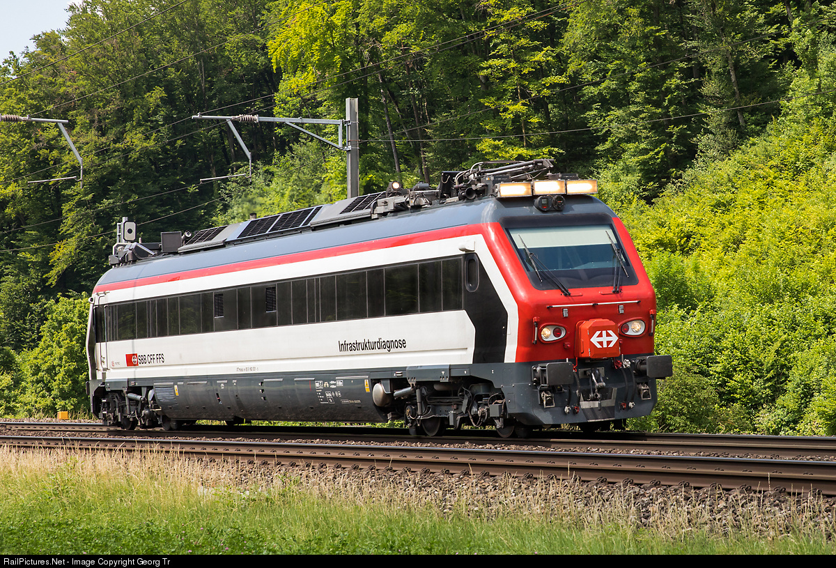 | Diesel powered measuring vehicle of the SBB Infrastructure XTmass 160 # 001 on a test run from Basel to Biel on the Hauenstein line between Gelterkinden and Sissach. With this vehicle, at least two times per year, all SBB lines were controlled and a large amount of data recorded. |