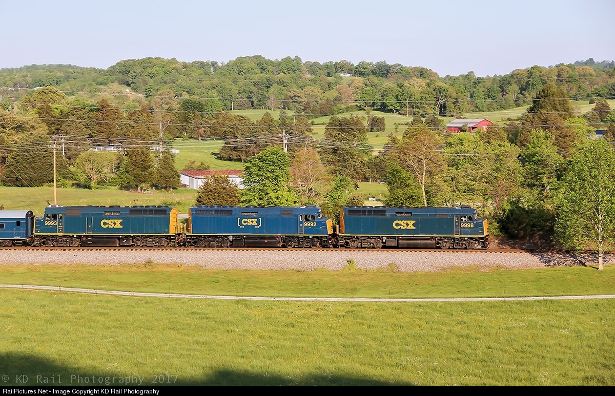 Cutting through the Appalachian country side heading south on the CSX KD Subdivision, is the CSX Executive train CSX P954-03 (Louisville,KY-Jacksonville,FL) pulled by a trio of F40PH-2s. The train spent most of the weekend in Louisville, KY with the higher ups of CSX attending 141st Annual Kentucky Derby. Now the train is deadheading back to the home base out of Jacksonville, FL. The train will eventually arrive in West Knoxville Yard, and the crew will swap, and the deadhead move will highball through the night on the K&A Sub to Etowah Sub "Hook & Eye" to Atlanta, GA, than onward to Jacksonville, FL. Photo from the John Kirk Collection