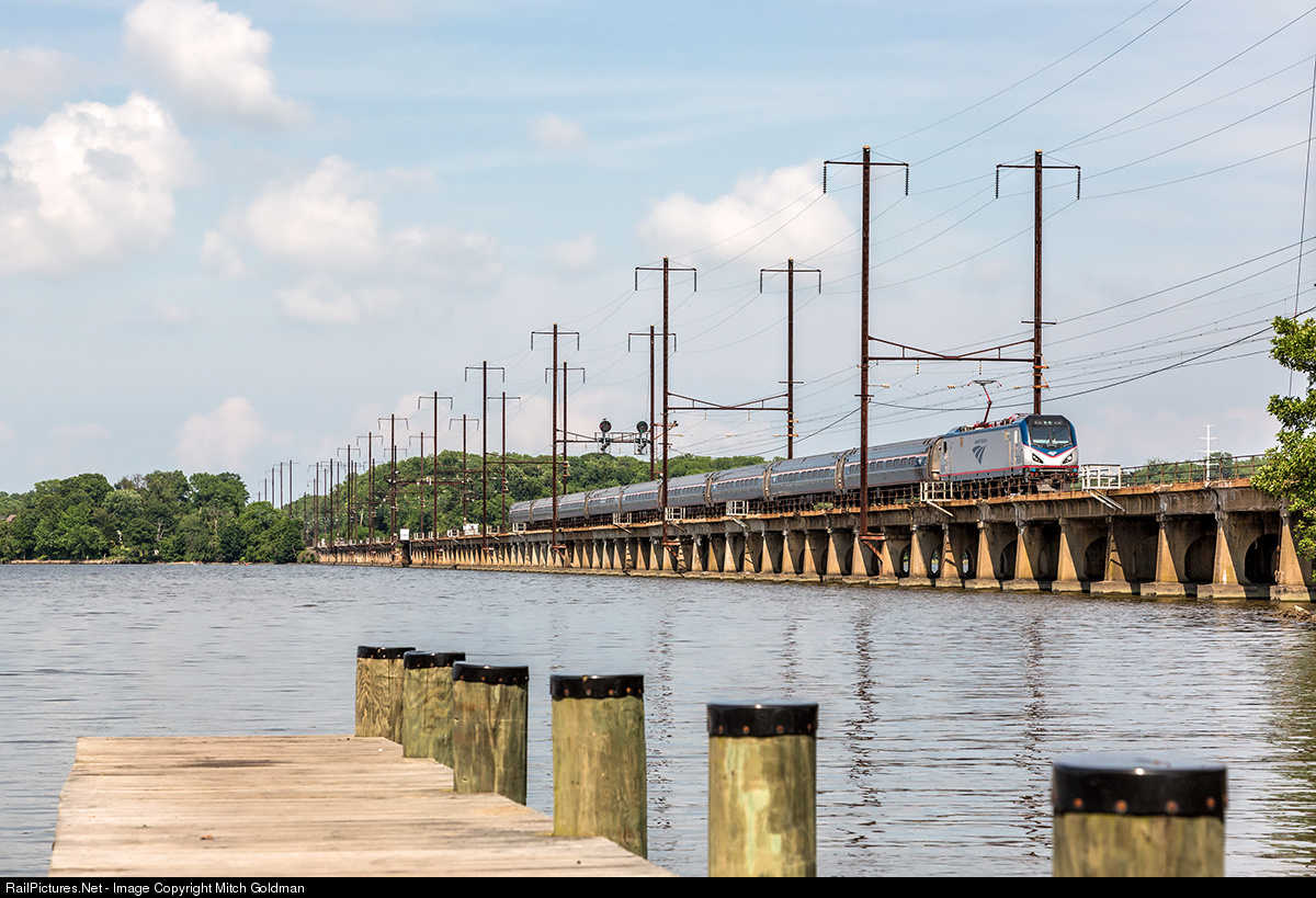 | An Amtrak Regional led by ACS-64 No. 630 crosses the Bush River in Edgewood, MD while en route to Baltimore, MD. |