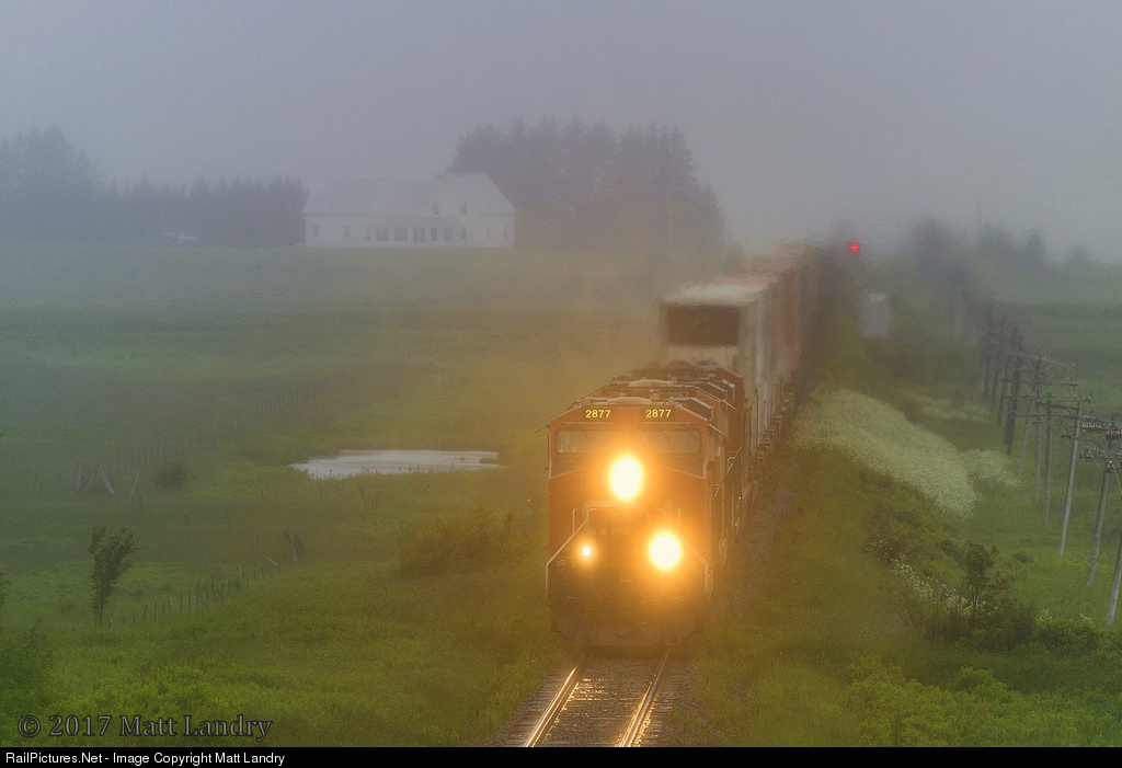 In threatening foggy weather, eastbound stack train Q120 continues on, as they've just crossed over the New Brunswick/Nova Scotia border, and are on the approach to Amherst, Nova Scotia. Amazing how weather in Atlantic Canada changes. About 20 miles west of here, it was almost clear skies.