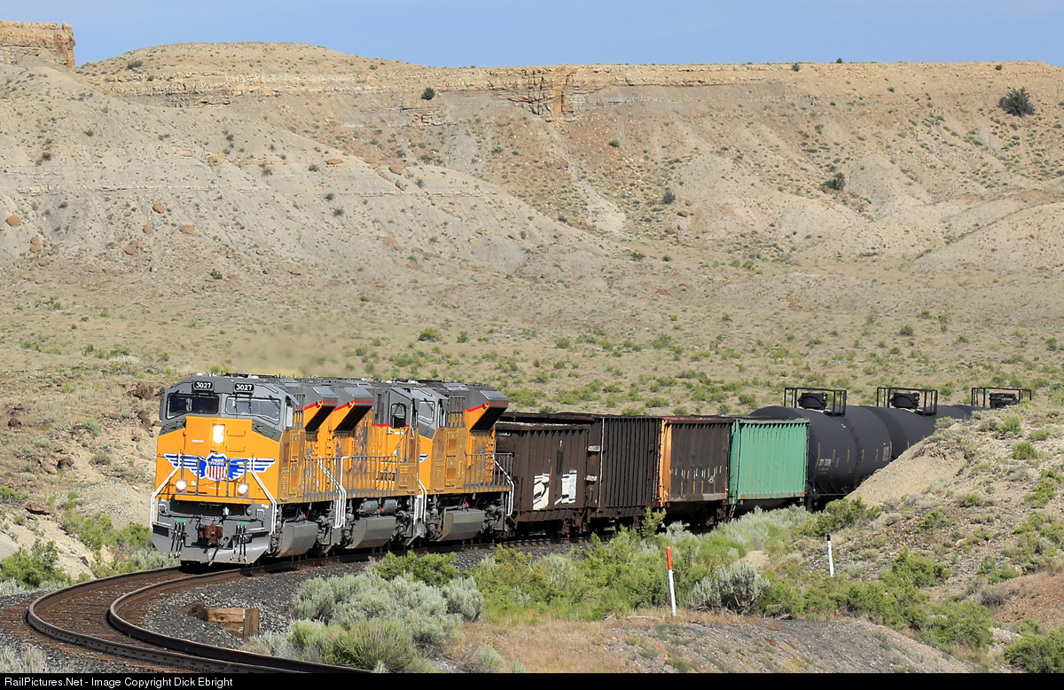 | Three brand new EMD SD70Ace-T4’s coming at you in eastern Utah. Thanks to a very helpful railfan in the Denver area I got enough advance notice of this MNYRO to get into position to capture these 3 new T4’s near Wellington on the Union Pacific’s Green River Sub. That new paint really pops in the bright sun. For those interested in Rio Grande history, this location is a railroad crossing of sorts. That gray mound of soil across the tracks from where I am standing is the original D&RGWRY narrow gauge roadbed built in 1883. The modern tracks are on the 1889 standard gauge realignment built in 1889 by the Rio Grande Western. |