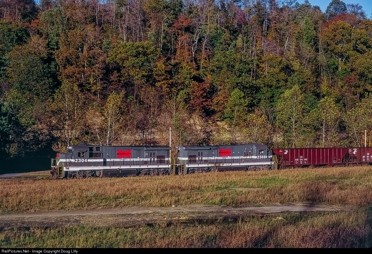 | Bringing a trainload of empties to the Loveridge Mine, two Monongahela Super7-23B’s pass through Keyport, West Virginia. |