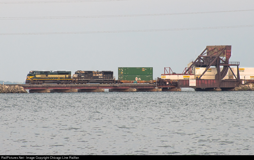 While many fishermen aren't paying much attention to the train in front of them, NS 25T with NS 1068, the Erie heritage unit, rumbles past Bay View, OH on the NS Sandusky Bay Bridge. NS 25T had to go a limit of 10 mph over the majority of the bridge because of high winds. Over the past years, many intermodal trains have blown over into Sandusky Bay because of high wind. NS, sometimes in the winter, pulls a loaded coal train to make a windbreaker because of these winds. You can actually see the wheels and axles of the remains of the train that the wind blew over in the water from a boat.