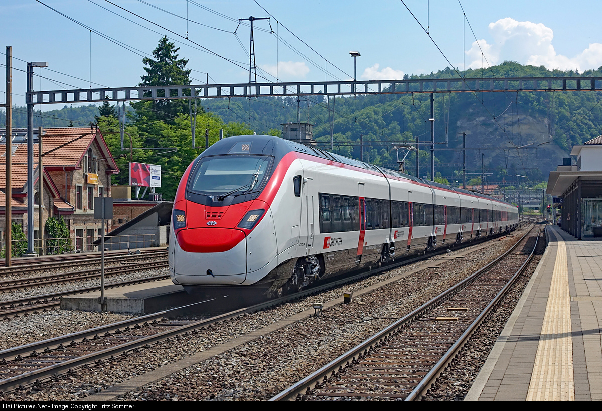 | On his journey from Sihlbrugg to Spiez, the brand-new Stadler "Giruno" RABe 501 001 (EC 250) makes a brief stopover in Burgdorf. |