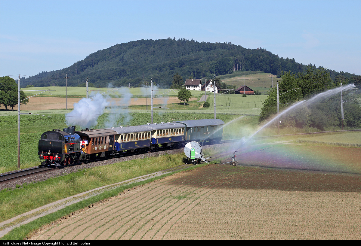 | Eb 3/5 # 9 was built 1910 by Maffei in Munich for the Bodensee-Toggenburg-Bahn (BT). The tank locomotive heads a train Etzwilen – Eschenz of association VES (Verein zur Erhaltung der Eisenbahnlinie Etzwilen-Singen/Association for preservation of the railway line Etzwilen-Singen). |