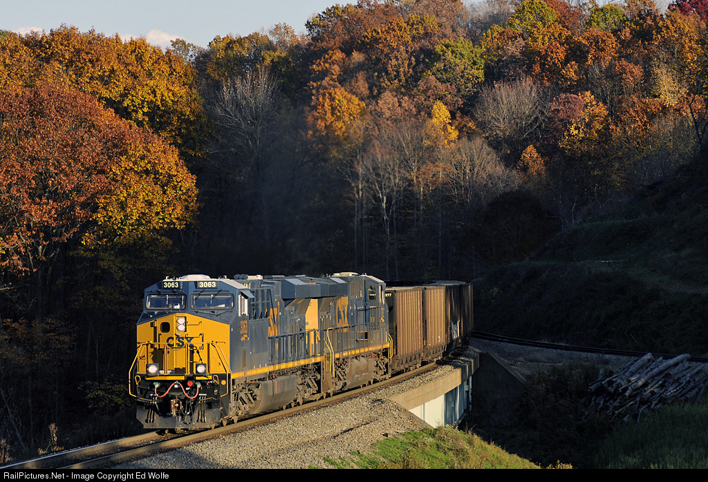 CSX 3063 South catches the last rays of sunlight at the crest of the Manor Branch on the ex-MGA. The empty hopper train is destined for loading at Bailey Mine.