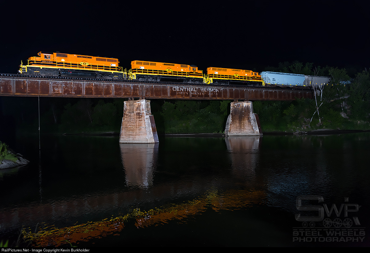 | No mistaking the line's heritage as the new look of the New England Central Railroad's nightly freight train is seen crossing the White River at Sharon, Vermont at 0330 hrs on June 23, with NECR SD40-2 (rebuilt) 3405 leading SD40M-2s 3475 and 3474. The train originated in St. Albans and is ultimately bound for Palmer, Massachusetts and saw the 3405 washed up for a series of PR photos. |